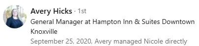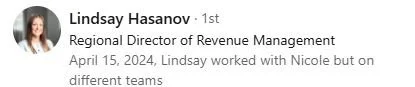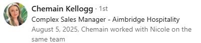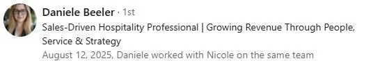 “Nicole is an incredible hospitality professional, who is well-versed in operations and sales. She is a true pleasure to work with. She brings new ideas, a positive attitude, and motivation for miles. Given the opportunity, I would work with her again and again in any capacity.”