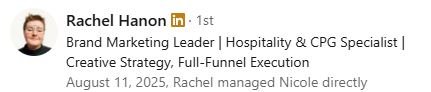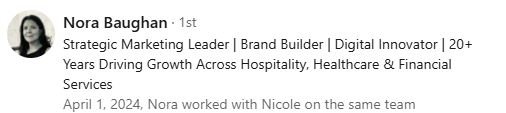 “Nicole is wonderful to work with. During our time together at PM Hotel Group, Nicole and I partnered on paid and social media strategies for three shared, full-service hotels. Each hotel was in a different market, with different needs. She effortlessly adjusted her communication style to each hotel team, offered relevant recommendations to improve online visibility and return on spend. Nicole was highly successful at capturing everyone's attention, and kept them engaged with her creative social marketing plans. She was efficient, her follow-ups and follow-throughs were always timely and we all looked forward to our calls with her. I cannot recommend Nicole enough and would be thrilled to work with her again!”