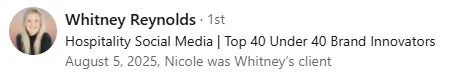 “I had the pleasure of working with Nicole on marketing three distinct hotels within a single Knoxville complex. From the outset, I was struck by her ability to navigate the nuances of multiple properties—each with its own voice, goals, and audience—with clarity and confidence. Nicole quickly became the go-to for everything from on-property programming and website updates to social media content approvals, email campaigns, and guest-facing collateral. She's one of those rare professionals who does it all—and does it well. Her collaborative mindset, strategic thinking, and can-do spirit make her an invaluable partner to internal teams, guests, and partners alike. I can’t recommend her highly enough.”
